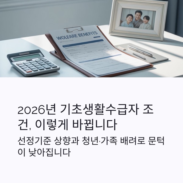 2026년 기초생활수급자 조건이 크게 바뀝니다. 핵심은 선정기준(소득 문턱) 상향과 청년·가족형 수급가구를 배려한 공제·재산 기준 완화입니다. 복잡한 용어는 최소화하고, 실제 신청·유지에 필요한 포인트만 간결하게 정리했습니다. 아래 5가지 소제목만 따라 읽으셔도 올해 무엇이 달라졌는지, 본인이 해당되는지 가늠하실 수 있습니다.